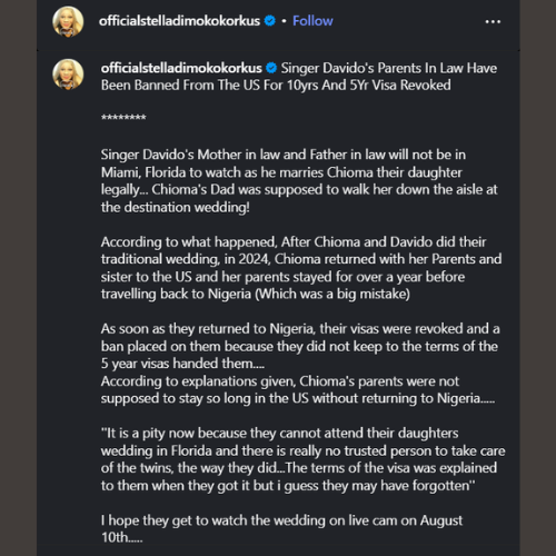 The blogger alleged that Chioma’s father was expected to walk her down the aisle, but that plan might be affected by travel restrictions. She claimed both parents reportedly overstayed their five-year U.S. visa during a previous visit, which may have led to its cancellation and a ban from re-entering the country. The post suggested that after Chioma’s traditional wedding, she, her sister, and her parents returned to the U.S., where the parents allegedly remained for over a year.