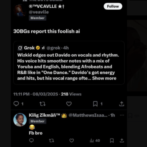As the debate spread, #GrokAI and #30BGvsGrok started trending on social media. Davido’s fans(30BG Gang) flooded platforms like X (formerly Twitter) with demands to report the AI for spreading misinformation. Some argued that AI should not rank artists, as music is subjective and deeply personal. Others speculated that the AI’s response reflected Western biases in music analysis, failing to recognize Davido’s vocal strengths and rhythmic versatility.