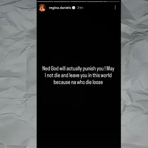 In her story, Regina Daniels wrote, “Ned, God will actually punish you!” She further added, “May I not die…” suggesting that she does not want to leave him behind in the world alone. The post has fueled speculation about the state of their relationship and the tensions surrounding their marriage. Fans quickly took to social media to react, with many expressing support for Regina while others debated the highly personal nature of her public statements.